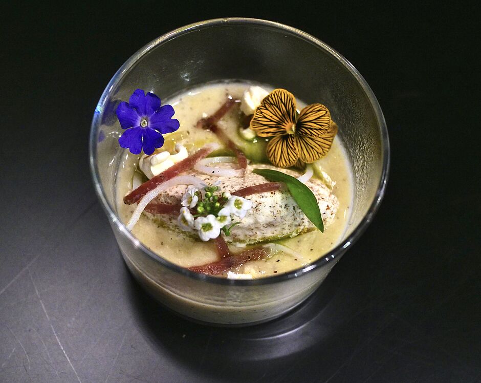 Verser la crème de maïs dans un verre ou un bol, verser un filet d’huile de ciboulette, placer quelques allumettes de jambon de Porc Laineux et disposer une quenelle de chantilly au centre. Mettre quelques pop-corn salé sur la préparation.