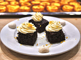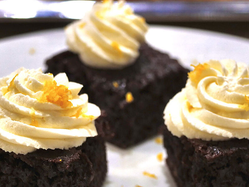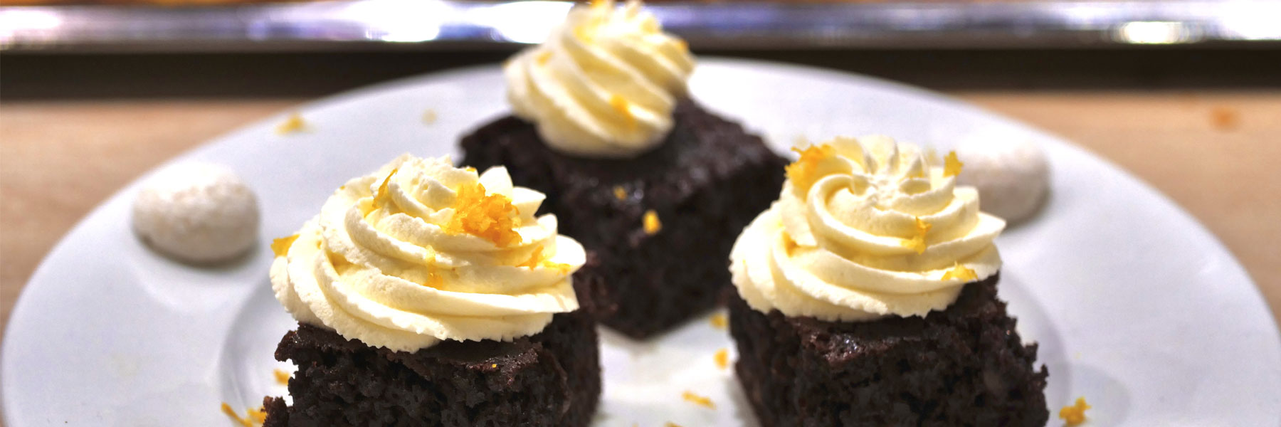 Découper le gâteau en cube d’environ 3 x 3 cm. Vaporiser d’Armagnac. Y déposer une meringue puis la recouvrir avec une rosace de chantilly. Râper quelques zestes de citron bio sur le dessus puis déguster.
