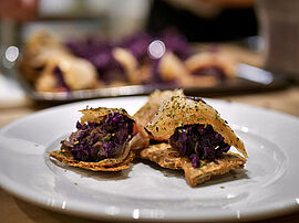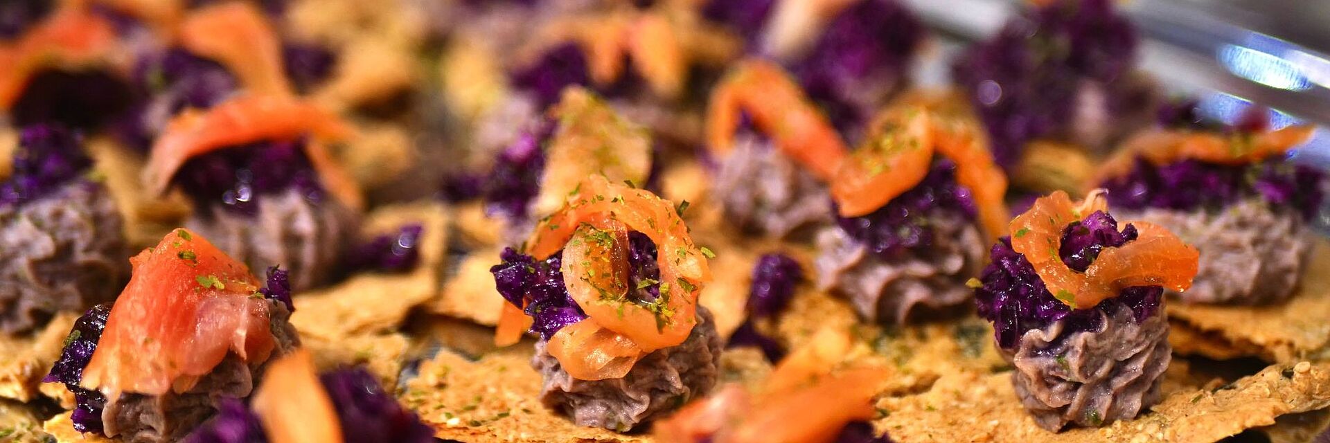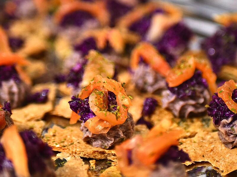 Couper les crackers, mettre le houmous dans une poche à douille et disposer une noix sur les crackers. Ajouter un peu de chou rouge, une lamelle de truite fumée et une pincée d’ail des ours