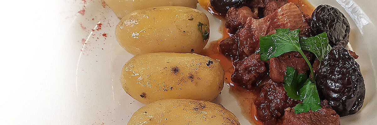 Laver et tailler les carottes et les oignons en mirepoix. Enlever les noyaux des pruneaux et les mettre à gonfler dans une préparation à base d'eau bouillante, des 4 épices et du gingembre.