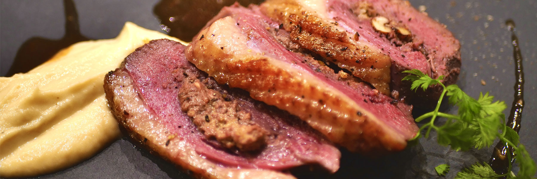 Faire chauffer la mousseline et la déposer en virgule dans une assiette. Déposer des tranches de magret à cheval et verser un cordon de jus.