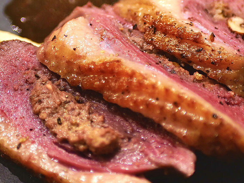 Cuire le magret dans une poêle chaude, mais pas fumante, en commençant par le côté peau durant 3 minutes jusqu’à coloration.