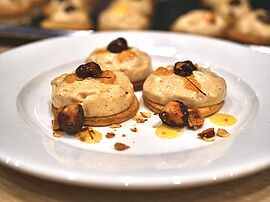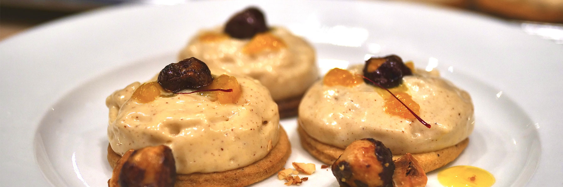 Garnir les fonds de tartes d’une cuillère de confit d’orange. Bien secouer le siphon et faire un joli dôme dessus. Déposer un point de gel de safran et finir par une noisette. La tarte est prête à servir. C’est un dessert à finir au dernier moment. Il peut être servi avec un sorbet orange à côté.