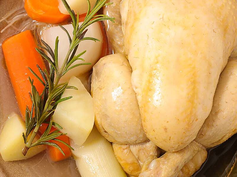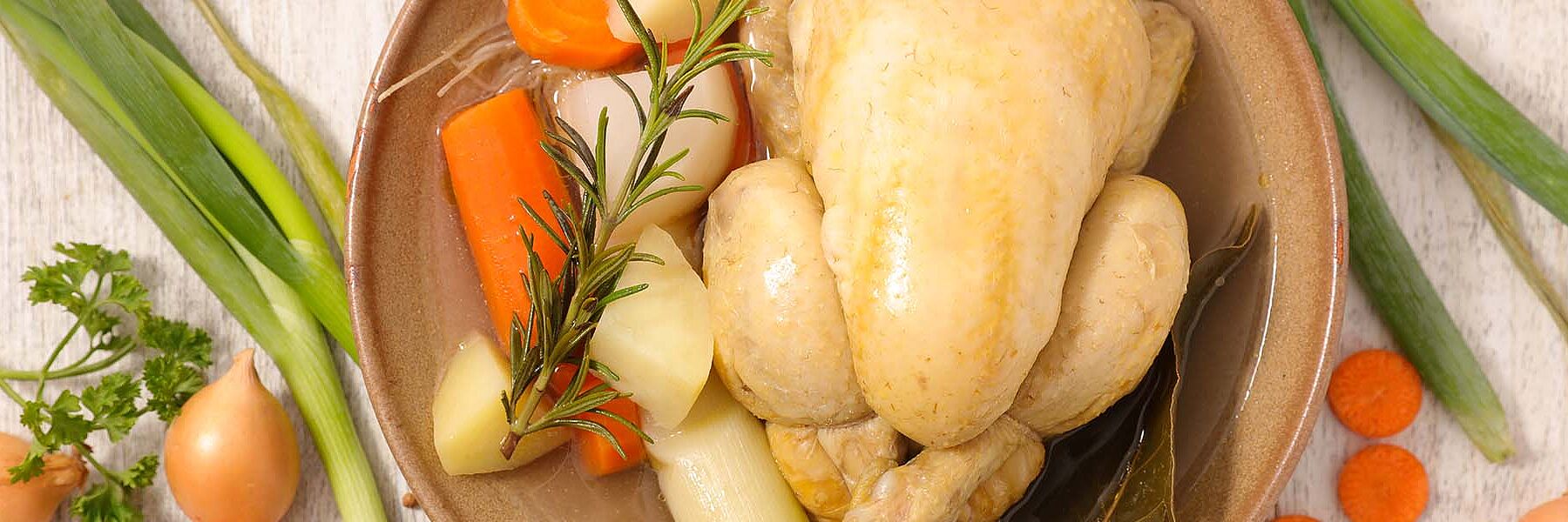 Farcir la poule Noire d’Astarac, coudre et brider. La déposer dans un grand faitout avec les pieds de veau Lou Bethet. Couvrir d’eau et ajouter l’oignon piqué de girofle et le bouquet garni. Porter lentement à ébullition.